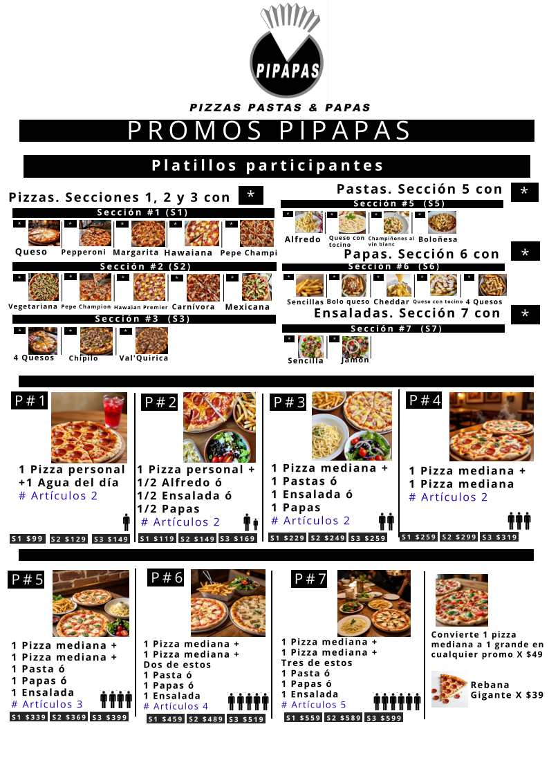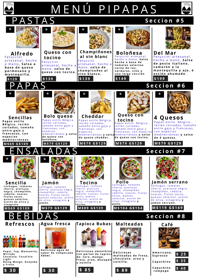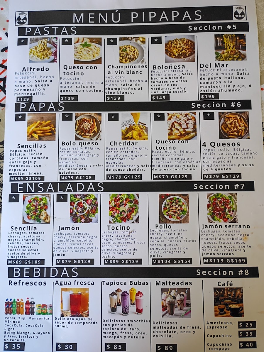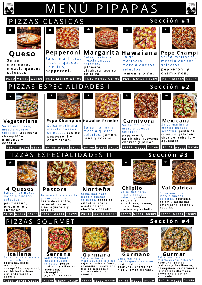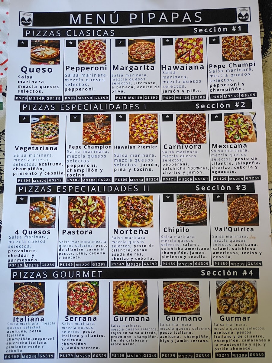 The menu at Pizzeria Pipapas offers a delightful selection of pizzas, pastas, and sides that cater to various tastes. For pizza lovers, there are personal classic options like Queso, Pepperoni, Margarita, and Hawaiana. The specialties include flavors such as Vegetariana, Peppe Champion, Hawaian Premier, Carnívora, and Mexicana. For those seeking something more unique, the menu offers the 4 Quesos, Pastora, Norteña Chipilo, and Val'Quirica. The gourmet pizza section includes enticing options like Italiana, Serrana, Gurmana, and Gurmano. For pasta enthusiasts, there's a range of hand-rolled pasta options such as Alfredo, Queso con tocino, Champiñones al vin blanc, Boloñesa, and Del Mar. The menu also features a variety of medium-sized potatoes like Sencillas, Bolo queso, Cheddar Queso con tocino, and 4 Quesos. For a refreshing side, you can enjoy Sencilla, Jamón, Tocino Pollo, or Jamón serrano salads. To wash it all down, there's an assortment of drinks, including Refrescos, Agua fresca, Tapioca Bubas, Malteadas, and Espresso. The menu's variety ensures there’s something for everyone, whether you’re craving a classic pizza, a gourmet twist, or a comforting pasta dish.